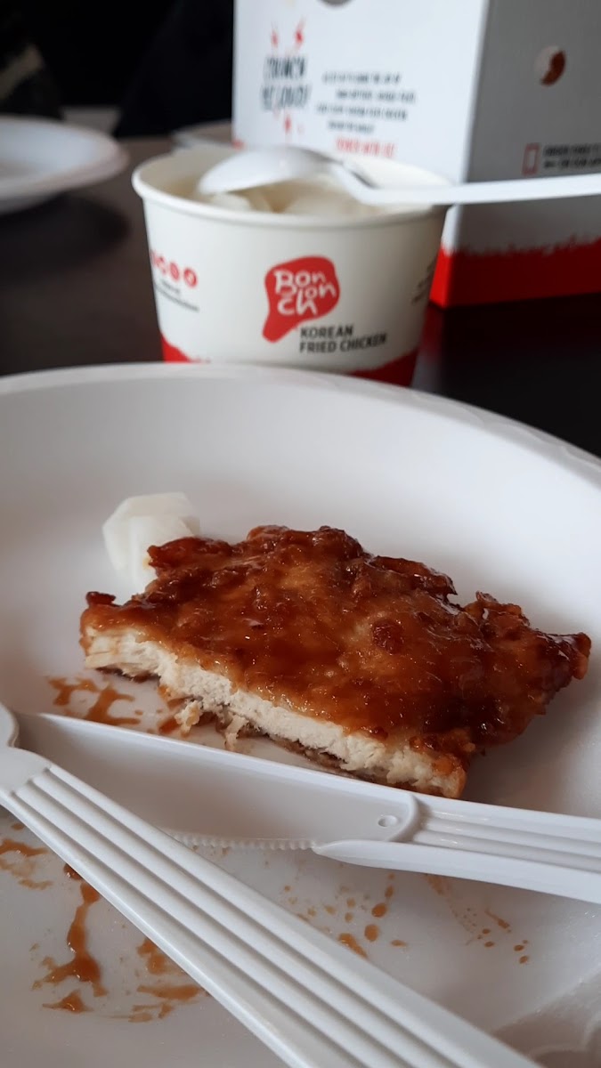 My husband and I have been eating at Bonchon for a while and really enjoy it. The chicken is always on point (my husband is very picky about dry chicken) and the other dishes we’ve tried are always good too. Tonight he had wings and I had some bao (the fried chicken and pork belly). I usually get the pork belly bao and always love it and today tried the fried chicken bao which was also very good. In the past we’ve also tried the japchae and the katsu, both of which were also tasty and well made. They don’t do table service anymore but you can eat it there after ordering. Some people seem salty about this but I’m like in this economy I’m just happy if they stay in business and I can have yummy chicken.