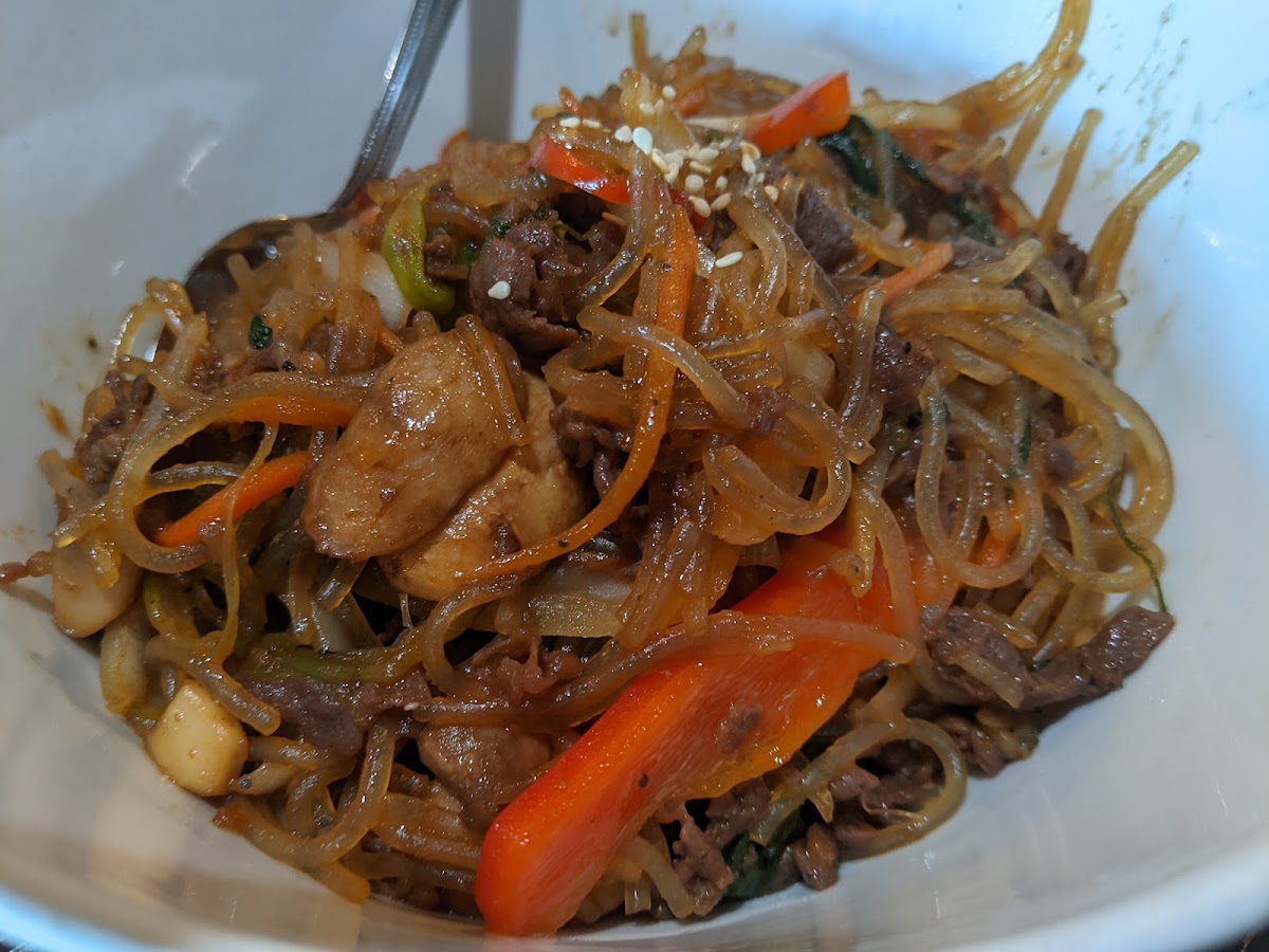 This is a food court style place. So there will be no rating for service. > Wings are crispy and tasty (dash salty on soy-garlic) We normally eat at Bon Chong and bb.q Chicken. > Takoyaki was just OK. >Japchae was tasty and perfect. >Bibimbap was tasty with shredded omelette instead of Sunny side up, also missing bean sprout.